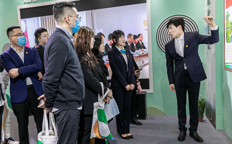 东庄水利展台以“让泾河成为造福人民的幸福河”为主题,由“强根固魂”“超越发展”“圆梦东庄”三部分组成,全方位展示公司成立五年来党的建设成果、工程建设成就及公司高质量发展成效,体现出公司坚持党的全面领导,提高党的建设水平,努力将东庄水利枢纽建设成生态工程、惠民工程、百年工程。
