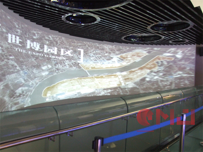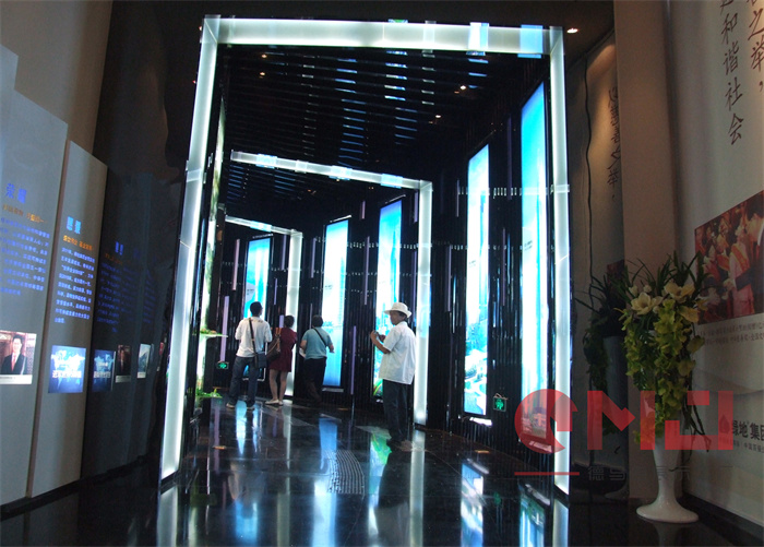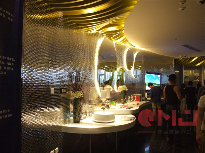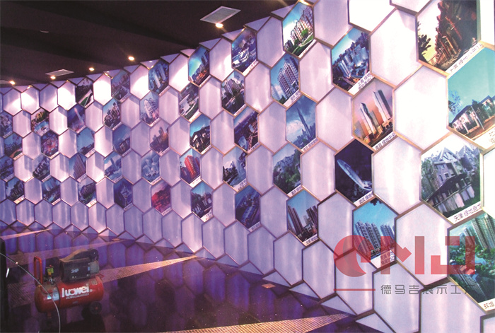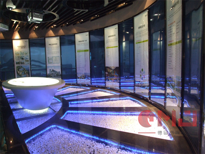 世园会绿地生态馆在现代装饰风格中融入生态元素,突显生态馆理念。区别于常规整体墙面造型,利用高低错落有序的独立墙体设计,使整个弧形墙面更加富有层次感;利用蜂巢状的阵列造型,让墙面显得更加自然、生动。而蓝色灯光的合理运用,让展厅在视觉效果上更加富有科技感。