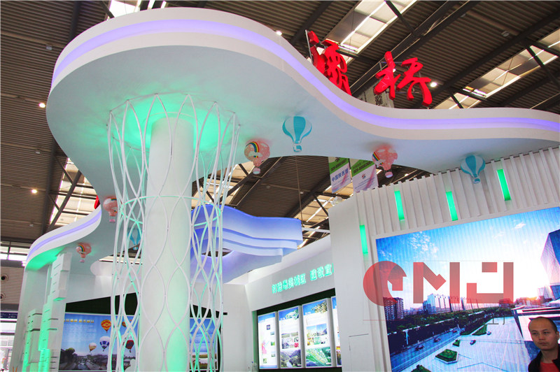 展位整体以白色为主,蓝 色发光灯带点缀,顶部“热气 球”装饰,在视觉效果上更加 清新,体现了灞桥区生态、宜 居的优越区位,利用LED拼接 屏播放灞桥区形象宣传片,打 造集产业、经济、文化为一体 的灞桥生态区。